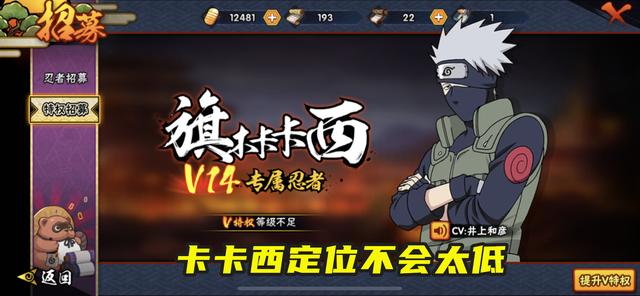当初看到忍战卡卡西要上架的时候,还在想这个忍者肯定不便宜,毕竟卡卡西这个忍者在动漫里不说是人气顶尖的存在,但起码也一直是老牌的高人气忍者。通过火影忍者手游手游内的几个卡卡西定位也能够看出,魔方也一直不会把他当成一个廉价忍者来制作,早期的少年卡卡西是金币购买礼包获取,后面的新春卡卡西是点券,神威卡卡西是高招。而V14的普通卡卡西是早期刚公测的时候招揽玩家的利器,有不少玩家当初也是一次性直接充到V14,就为了拿到这个卡卡西。