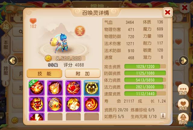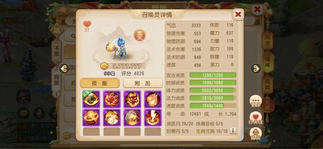 从楼主的展示的图来看,这只御风童子目前的售价是977W金币,法力资质2819和体力资质5502都很不错,防御资质1099也已经超过了上限,1.264的成长在勇武组中更算得上顶尖,的确令人赏心悦目。