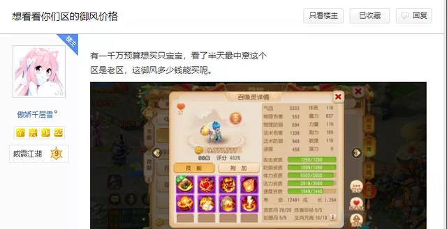 近日,有位玩家晒出了自己在老区心仪的一只御风童子,并称自己有一千万的预算,希望广大网友帮忙看看是否值得入手。此言一出,立刻吸引了不少玩家的关注,大家都十分好奇这只御风童子的属性和技能配置。话不多说,让我们一起来围观一下吧。