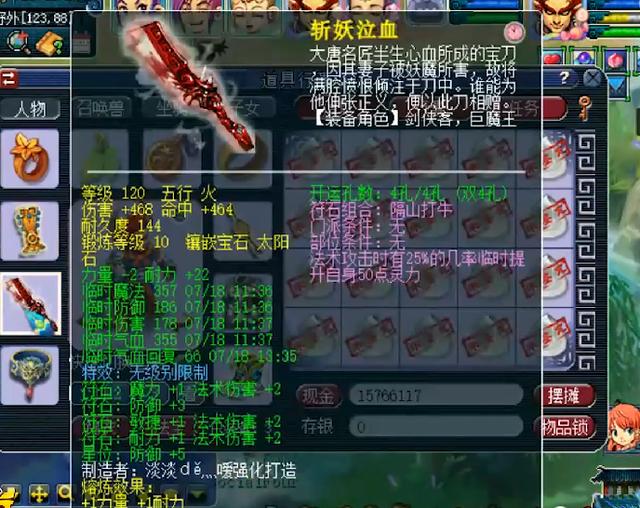 一个角色强不强,最主要的还是看武器配置的属性。该玩家带的武器是一把140级无级别刀,单加耐力22,锻炼10段太阳石,武器伤害468,命中464,总伤害623。综合属性虽然有点略低,但作为69级的武器可以说是极品了。