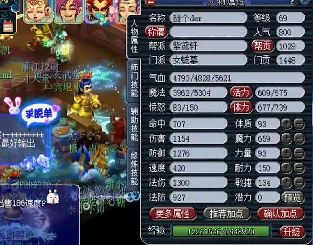 整个角色配置下来的属性是这样子的,69级女魃墓门派,伤害破千达到了1154,法伤1300,防御属性1276,气血上限5621。号主扬言称这个号挑战地煞星可以挂机过,根本没有什么压力。这点我信,毕竟1星地煞星难度很小,你去挑战6星挂机试试?