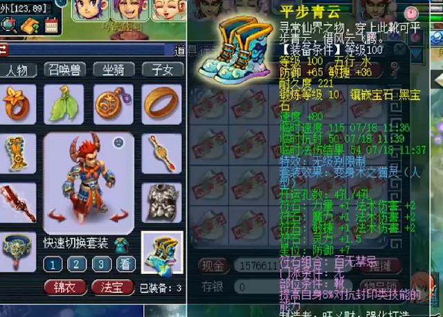 鞋子部位是100级无级别,锻炼宝石等级10级黑宝石,防御属性65,敏捷36,点化了猫灵变身术套装效果。