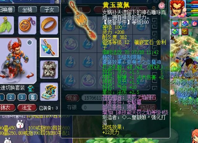 腰带也是70级人造无级别,防御属性爆了不少,综合防御46,镶嵌的是11段加气血属性的光芒石。项链方面,100级无级别炎魔神套装,总灵力230。