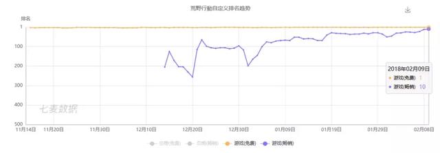 而在《荒野行动》开启商业化之后,在日本App Store畅销榜的成绩也让人眼前一亮。从排名曲线看到,《荒野行动》在日本市场的营收初期有较大的波动,在1月5日之后便保持着相对稳定的上升趋势,在2月9日登上了日本App Store畅销榜TOP10。