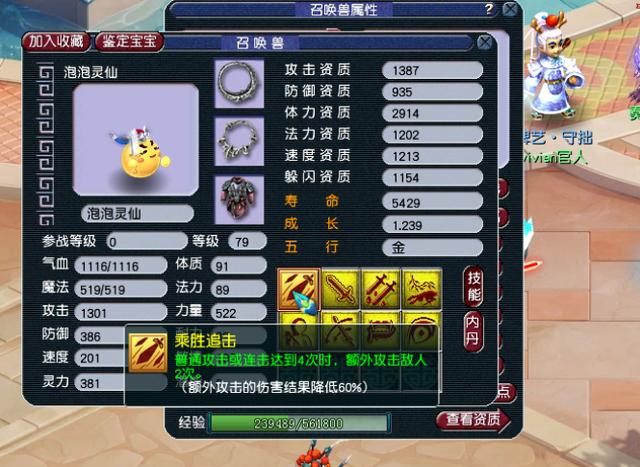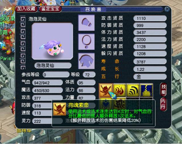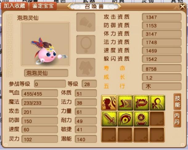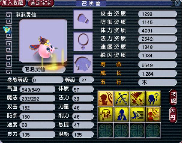 这只满技能的泡泡灵仙·飞燕女(泡泡灵仙最多八技能)凭借着“顾盼生姿”和“死亡禁锢”两个特殊技能晋身为最具有潜力的泡泡灵仙!虽然有些资质不是上佳,但是被玩家高价购买,而且为其准备了一本“法术防御”兽决!到时候出场“法术防御”,然后“死亡禁锢”,两个特殊技能定能让主人封印命中率升到极致!让我们期待它的华丽转身吧~