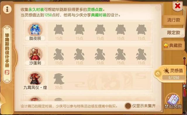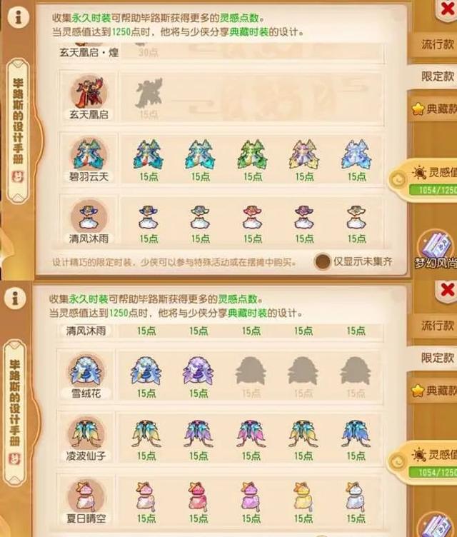 限定款:永久时装每件+15点灵感值(比如碧雨云天,清风沐雨,凌波仙子)