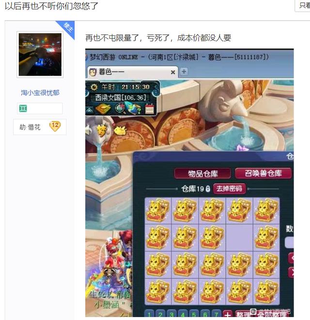 跟风囤限量的后果当然是陷入商人们的圈套啊!自从浪淘沙锦衣礼盒出现过暴涨的情况后,就再没有限量礼盒涨价涨得很夸张了,因为现在眼花缭乱的限量太多,再加上藏宝阁上基本上好点的号都是带限量走的,何必纠结于某一种限量呢?这位玩家就是血与泪的教训啊,跟着别人囤礼盒囤了好几次全囤的些卖不掉的东西,真惨!