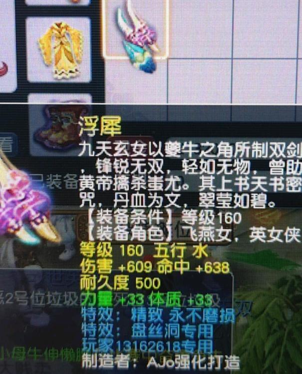 虽然自己的号不是特别好,但是打一把160级的武器还是打得起的。原本150级的双剑打废了就随便幻化下,没想到出现专用弹窗!这鉴定完后看到一排排的蓝字是真的舒服,精致+永不磨损的160级武器,力量、体质双加66,伤害609、命中638。唯一可惜的是这武器仙族不能用,人族物理就只有天机城和大唐官府了。自己是个盘丝号,转大唐其实也没区别,毕竟都不好组队。