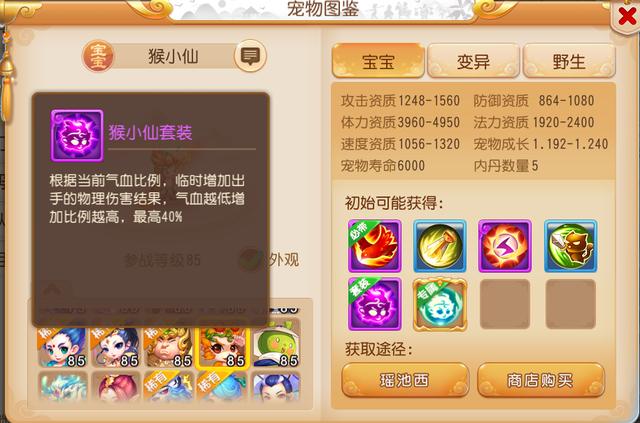 在《梦幻西游》手游中,猴小仙是勇武组中比较特殊的一只宠物,虽然自身拥有着较高的攻击资质与体力资质,但无奈必带技能较少,所以用来合成多技能攻宠的难度甚至相比于稀有宠物芙蓉仙子还要高,因而在摆摊商城中极品的猴小仙非常罕见。