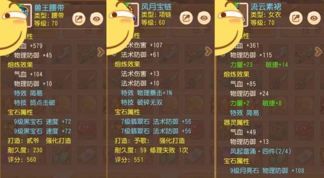 而在腰带与项链方面搭配的同样是双蓝字装备,其中腰带是70级简特装备,携带弱点击破的特技,可以忽视目标大量物理防御进行攻击,能够针对高防单位;项链是一件60级装备,不仅有物理暴击特效加成,还有PK神技破碎无双,可以在战斗中消耗对方的蓝量干扰战术安排。在衣服方面虽然没有特技,但是却有不俗的基础属性,以及力敏绿字双加属性,对于人物的输出与速度面板有着不小的提升。
