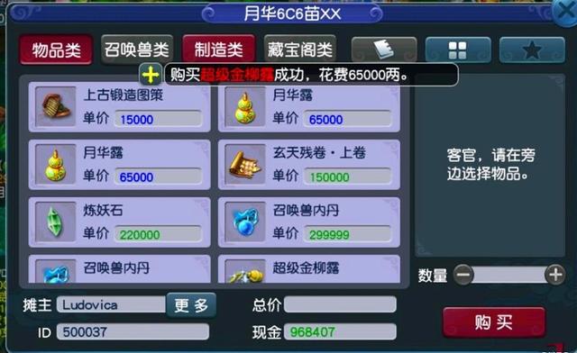 上面的这位玩家以6.5万两梦幻币的价格购买了一个超级金柳露,绝对是摊主摆错价了,小编感觉应该是摊主将超级金柳露当成月华露给上架了,因为上面这个摊位中的月华露的价格就是6.5万两的梦幻币。