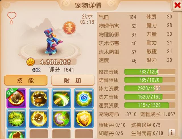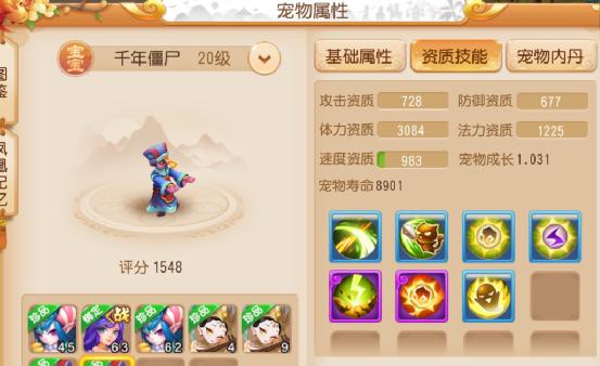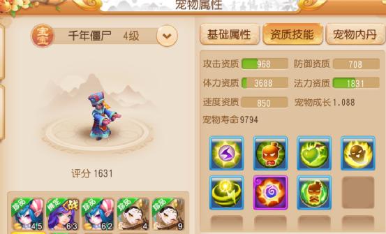 最后一只同样是7技能的僵尸胚子,968的攻击资质、708的防御资质、3688的体力资质、1831的法力资质和850的速度资质与前两只相比也相差不多,可以说这三只宠物在资质方面确实“毫无天赋”,任谁看了也会哭笑不得。