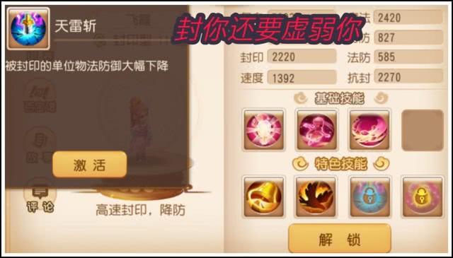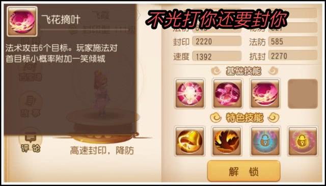 第二个技能[一笑倾城]封印敌方3个目标的法术,首目标额外增加10%命中率,持续2回合,虽然不持久但是人家封印数量多不是。输出技能[飞花摘叶]法术攻击3个目标。对首目标小概率附加一笑倾城,也就是相当于两个技能的叠加,只是技能威力有一些折扣,但是复合起来以后总得来说还是有了很大的加强的。被动技能[天雷斩]被封印的单位物法防御大幅下降,也是为封印技能辅助。天外魔音,大幅度提高封印命中率,堪称神准的封印。