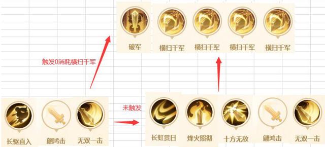 通过自身恢复斗气+技能攒斗气=破军+横扫千军,在使用“无双一击”触发0消耗的“横扫千军”后立刻释放“破军”加“横扫千军”。 如果只触发0消耗的“横扫千军”,满斗气只能释放3次,如果既触发了0消耗,又使用了破军,满斗气的“横扫千军”可以释放6-7次。