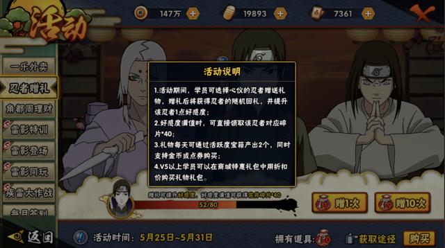 如果不是V5玩家,除了活跃度的14个礼物以外,还需要购买58个,所以只能直接购买58*50金币=2900金币,不过这个价格直接购买一个限定忍者还是比较划算的,一般这个金币直接抽是肯定抽不出来的,只是这些限定忍者稍微有些过时,就看个人的喜好了,论强度来说,必须选宁次。