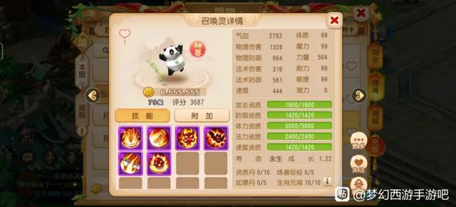 从截图上来看,这只超级大熊猫的攻击资质1600,防御资质1420,体力资质5000,法力资质2400,速度资质1420,,居然全都是满的,1.22的成长值也比较优秀。不仅如此,我们再把目光转向技能栏。这只超级大熊猫有6个技能格子,第一个是它必不可少的特殊技能--破竹,作用是受到伤害时有概率被激怒,激怒后下一次攻击将附带重伤效果;未被激怒时受到的伤害减免20%,可谓又能打又能抗。