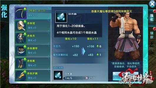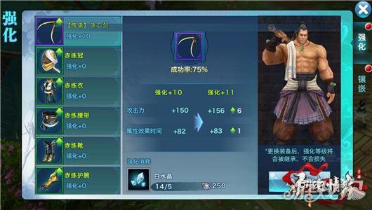 在强化系统中的装备在左侧是以列表的形式竖列排放,同时显示装备名称、品阶、当前强化度详细信息;强化系统的中部显示当前选择强化的装备成功率(初始成功率为100%)、强化当前等级属性、下级强化等级属性;下方显示需要消耗的水晶数量和银两;如果想要对当前装备进行强化,点击强化按键就可以了哦。