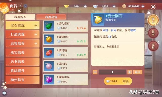 可以使用同类型的宝石对宝石进行升级,一颗宝石升到12级总共需要1+2+4+8+16+30+51+88+150+255+412+696=1713颗1级宝石。在交易行所有宝石的初始价格都是2000银子,按照这个价格来计算,也就是1713*2000=3426000银子,也就是342.6万银子。