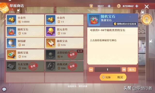 在帮派商店可以使用帮贡兑换宝石,消耗128帮贡可以兑换随机数量(1-10个)的宝石,每天上限5次,建议欧皇兑换,非酋很容易亏本。