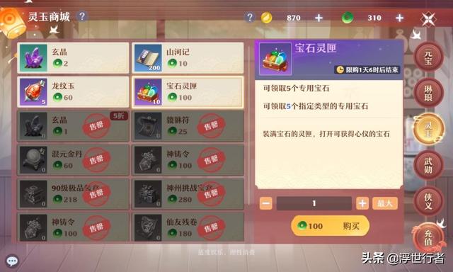 首先侠义商城和灵玉商城每周15个宝石灵匣是必须兑换的,优先级最高,不容错过。单纯靠这些宝石前期基本可以跟得上等级,但是后期想要升到满级(装备限制最高级)就没那么简单了,必须在商行再购买一部分才可以。