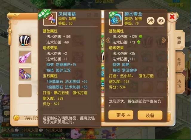 两条双蓝字的项链,一条是60级项链,拥有特效物理暴击+1%以及破碎无双特技,破碎无双对于低防御的输出门派有奇效,一刀下去对方蓝条见底很可能整场都没什么作为。而包裹里的项链则是简易加罗汉金钟的组合,当对方法系门派较多时,罗汉金钟减法伤就非常重要了。