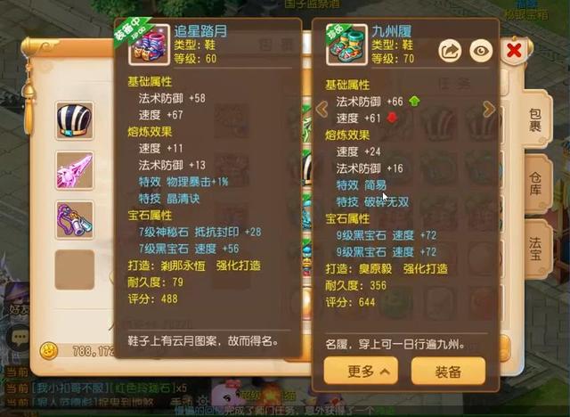 最后是两个双蓝的鞋子,包裹里的是70级简易破碎鞋,而装备中的60级鞋则是物理暴击+1%以及晶清诀。晶清诀可以解除己方全体的异常状态并回复15%气血,用好了可以瞬间逆转局势,还是相当不错的。
