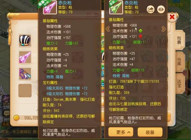 首先是两把非常暴力的简易满伤武器,熔炼后物理伤害都达到了593,装备中的武器绿字属性单加力36,最终的物理伤害是629,伤害非常惊人。而包裹里的这把武器绿字属性力敏双加42,伤害也很不错。