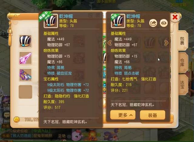 接下来是是两个个70级的简易特技头,熔炼以后物理防御都达到了82,不得不说熔炼以后的属性还是很不错的。装备中的这个头盔特技是破血狂攻,消耗愤怒值无视封印攻击对方两次,是物理门派非常重要的特技。包裹里的头盔特技则是弱点击破,可以无视目标大量防御进行攻击,专门针对女儿村、化生寺等防御高的门派,也是一个非常不错的特技。