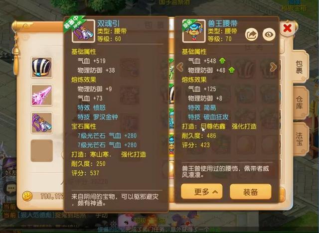 双蓝字的腰带也有两个,一个是70级的简易破血腰带,另一个是60级的愤怒罗汉腰带,虽然70级腰带相比60腰带不仅基础属性高了很多,还可以多镶嵌2级宝石,但是在战斗中愤怒特效还是比较重要的。毕竟减少愤怒消耗就能更快使用特技,一个特技就有可能转变局势。