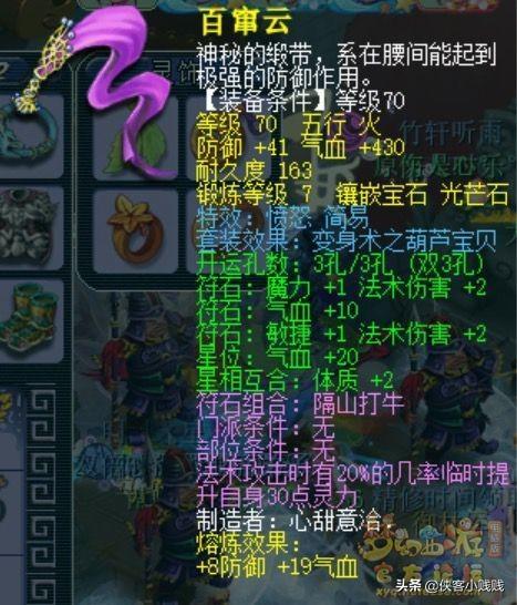 一位玩家花了2.4亿梦幻币买到炎魔神三件套,227:3000的比例,大约是1800出头,我们来看下值不值吧!120级的腰带,8锻光芒石,68的防御和608的气血。