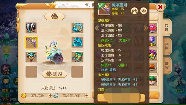 先来看看该玩家的武器,70级简易双加的灵犀望月,法术伤害达到了124。就这件装备来说的话,确实不怎么样。基础法伤才101不说,绿字加的也是体质跟力量。不过装备宝石是9级舍利子,勉强可以用。头盔的话,是70级带简易特效的乾坤帽,魔法464,物理防御75,从属性来看的话,还算可以,就是熔炼还差了不少。不过打上了9级月亮石,这一点还可以。