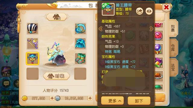 项链的话,是70级带简易特效的碧水青龙,法术伤害130,法术防御70,打上9级舍利子。剩下的装备也同这件装备一样,都是简易特效加9级宝石。就这一身装备来说,也就满宝石比较亮眼,其他的都不值一提。简易特效虽然不错,但全身一个特技都没有,这真的没问题么?哪怕是来几个法爆也行呀。