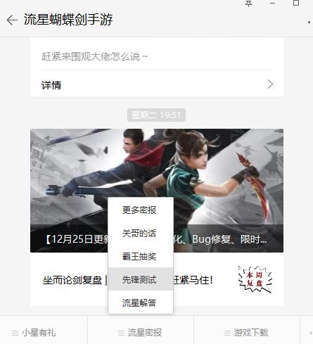 先锋测试服除了有《流星蝴蝶剑》最新的内容先锋测试,还特意为玩家们准备了参与福利,将会在先锋测试服开启后公布~