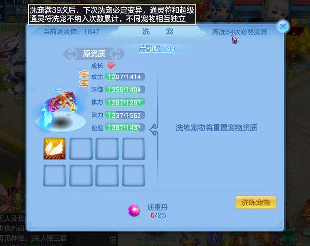 大家对于心仪宠物认知的区别也决定了洗宠的难度。想要兼顾满技能,红心成长,初始资质出色这三个方面,需要付出的还童丹大概率是比其他玩家更高。这个时候心态就成为了很重要的一个因素。虽然吉祥平时说"欧皇""非酋"什么的,但实际上,在长时间的游戏中大家的运气都是守恒的,因此即便暂时没有出,不久之后相信就会有所回报。