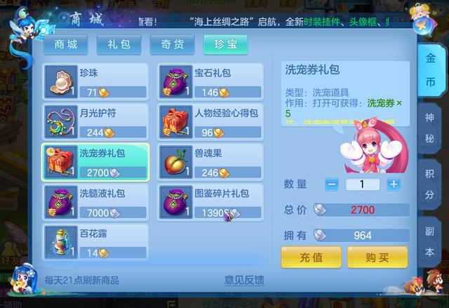 在《神武4》手游中还童丹虽然是几乎所有玩法都会产出的道具,但总是"丹到用时方恨少。"因此合理使用还童丹是我们洗宠的第一步。比如说我们在有洗宠券的时候洗宠,这样可以节省一半的还童丹消耗。除了日常活动可以获得,每周五也会有5个限时洗宠券,另外各种商城也有洗宠券礼包,出产的地方还是非常多的。