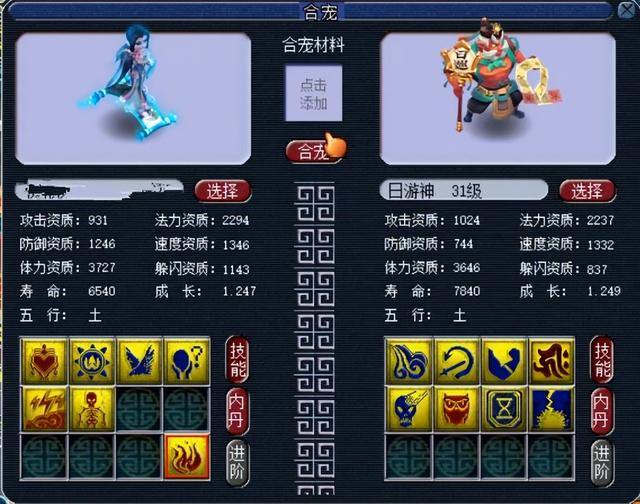 大家应该都清楚上面这组炼妖的意图吧,上面的这组炼妖是想要获得出其不意须弥的,用的是一只六技能的画魂和八技能的日游神,只不过画魂认证了一个必带的技能,所以,合出来的召唤兽造型如果是画魂,技能的数量会多一个,最多能够获得拥有者15个技能的画魂或者14个技能的日游神。