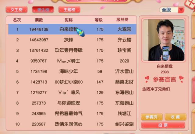 男生榜的第一名还是白来烦我,目前已经1944W,不过第二名和第三名分别是1400W和1300W。