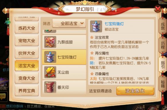 七宝玲珑灯最后我们来看看七宝玲珑灯的四象属性该怎么选。先看两仪属性,阳属性可以提升七宝的触发几率,阴属性也可以提高触发几率,并且还比阳属性提升的触发几率要高,但是需要队友佩戴七宝才行。
