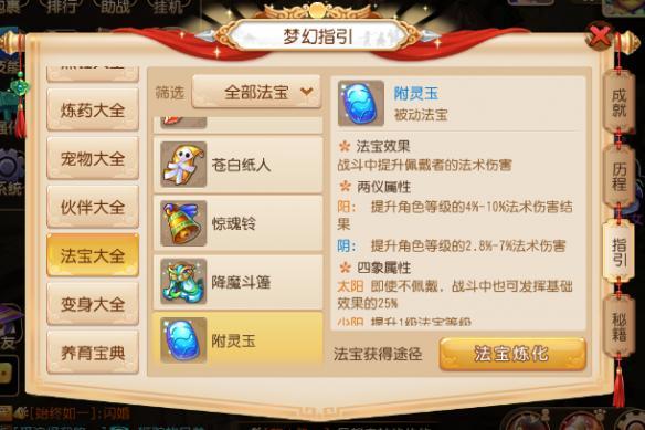 附灵玉附灵玉的四象属性很好选择,因为除了太阴属性之外,其他的三个属性对法系的帮助微乎其微。太阴属性需要两仪属性是三条阴属性,而阴属性正好是法系特别喜欢的法伤,所以关于附灵玉就不多说了,选太阴属性准没错,%的暴击率和法术伤害的加成可是能让法系的爆发力提高很多的,万一就因为这个暴击就能击杀关键NPC。