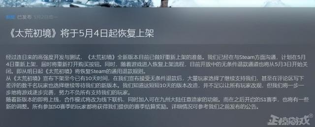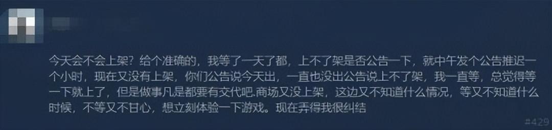 就在5月2日,官方发布公告表示会在5月4日的中午12时重新上架该游戏。在5月3日凌晨却莫名其妙进行了一次上架,一个小时后该游戏再次变成不能购买状态。在5月4日中午12时,官网准时发公告表示将会延迟上架,预计到13时。可是该游戏一直到了5月5日才正式开放了购买通道,而该条公告下方已经被玩家怒喷了数十页之多。