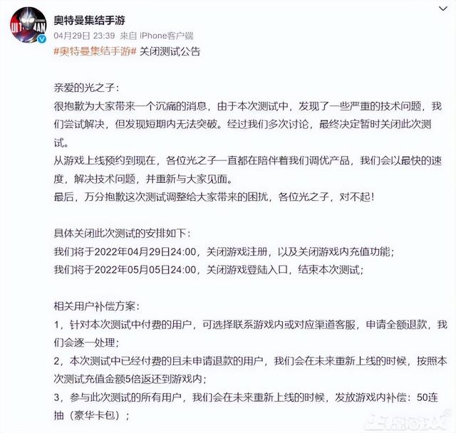 《奥特曼:集结》的官方之前就表示该游戏耗时2年研发,拥有《奥特曼》系列的正版版权,可以说从游戏刚公布就吊足了玩家们的胃口。该游戏也是如约在4月29日进行了付费删档测试。但是出人意料的是,该游戏仅在开服当天晚上官方就宣布游戏将关闭测试。