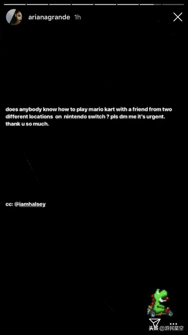 近日Resetera网友发现,人气歌手“A妹”爱莉安娜·格兰德在自己的Instagram上求助:嘿,有人知道该怎么跟其他地方的朋友用任天堂Switch联机玩《马里奥赛车》吗?