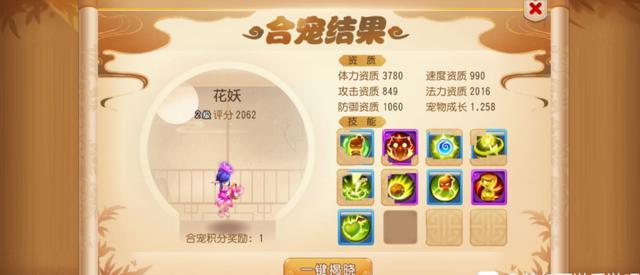 这名玩家倒是没有继续卖关子,随即放出了最终的合宠结果,神宠出世!合出来的是一只9技能花妖!这份运气也太令人羡慕了吧。