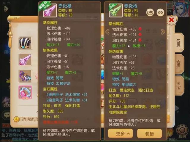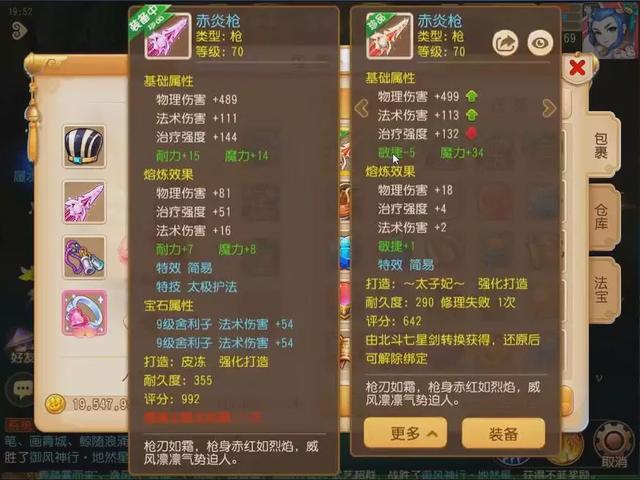 而仓库里另一把武器同样是简易特技武器,但是这把武器的绿字属性则是敏魔双加44,这把武器就是为敏龙而生的了,特技笑里藏刀可以减少敌方单体70点愤怒,由于超高速的龙宫一般比普陀化生还要快,因此笑里藏刀对于需要靠特技吃饭的辅助就显得很致命了。三把武器镶嵌的都是两个9级的舍利子,增加法伤不用多说。