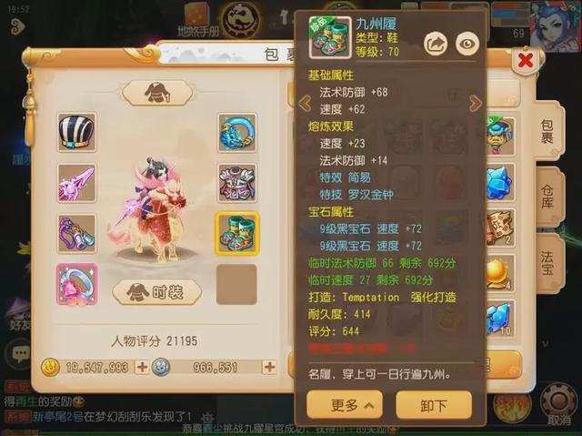 这双九州履熔炼后速度85算是比较快了,同时还镶嵌了两颗9级的黑宝石。而特技罗汉金钟这个大家应该都比较熟悉,使我方全体受到的法术伤害减少50%,这个特技在战斗中的重要性就不再赘述了。