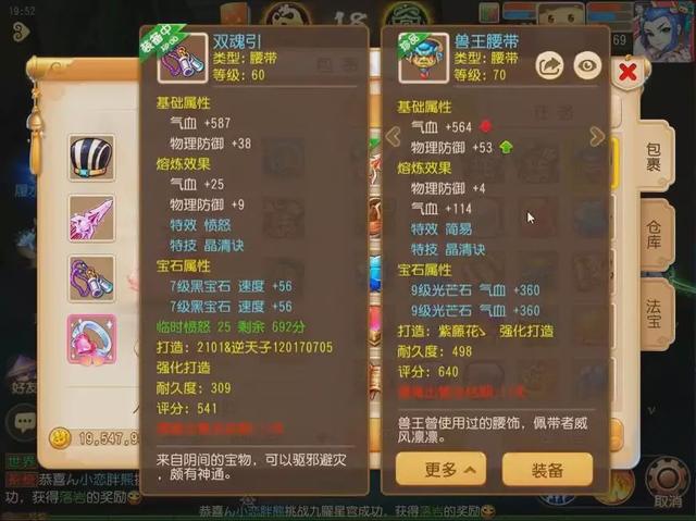 最后是大神的两条腰带了,装备中的腰带是一条60级的愤怒特技腰带,特效愤怒可以使战斗中愤怒值的消耗减少20%,而宝石镶嵌的是两个7级黑宝石,这个腰带是为敏龙准备的,加速度的同时可以释放更多的特技,而包裹里的腰带则是70级的简易特技腰带,镶嵌了两个9级的光芒石来增加气血,这个就是为龟速龙而准备的了,增加气血可以让龟速龙有足够的血量站到最后来守尸。