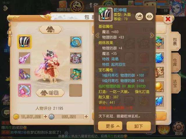 这个头盔镶嵌了两个9级的月亮石,物理防御无论对于哪个门派都是非常重要的,毕竟站得住才有机会输出。