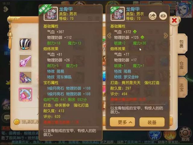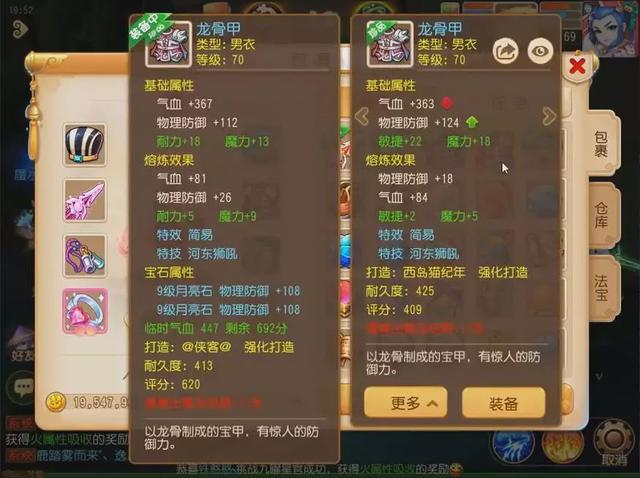 衣服方面这位大神同样有三件不同的衣服,装备中的70级简易特技男衣,绿字属性魔耐双加45,特技河东狮吼可以降低敌方全体15%造成的物理伤害结果,在面对物理门派较多的队伍时可以有不错的效果,包裹里的两件衣服,一件绿字属性加37魔力减1点敏捷,特技罗汉金钟,另一件绿字属性魔敏双加47,特技河东狮吼,这三件衣服分别和3件武器的绿字属性搭配,可以根据团队的需要来决定是龟速龙还是敏龙。