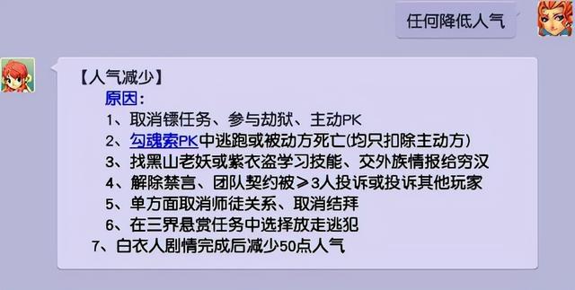 那么现在的梦幻中有哪些方式是可以降低人气的呢?在黑山老妖和紫衣道那里学习技能是降低人气最快的,但是这样是有下限的,除此之外,小编认为最快的降低人气的方式就是主动pk,弄两个低等级的小号在江南野外把他们给杀死,这样就会降低大量的人气,但是这样还会降低阴德,那些不想降低阴德的玩家,就只能通过取消押镖、投诉等方式。