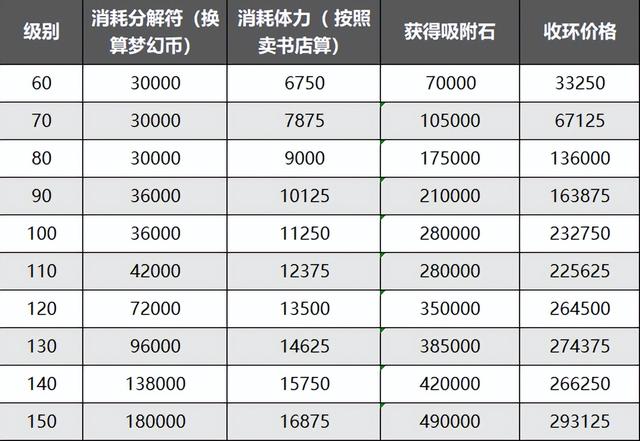 把其中的分解符和体力,换算成梦幻币成本,获得的吸附石换算成梦幻币结果,然后把结果减去成本,可以得到收分解装备的价格表。